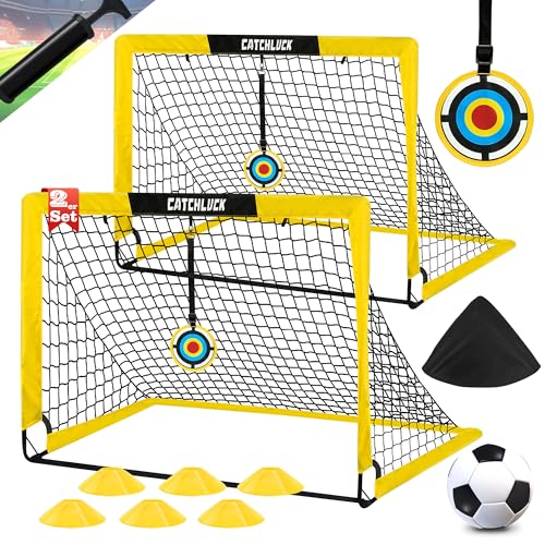 CATCHLUCK Fotbollsmål för Trädgård Barn Pop Up 2st Set Med Fotboll, 6 Fotbollskon, 8 U-Formade Markspikar Och Bärväska (Gul)