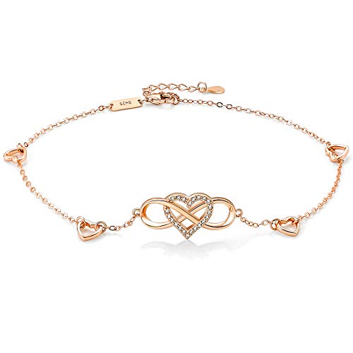 Vristlänk dam oändlighetstecken 925 sterlingsilver äkta silversmycken för kvinnor flickor, glitter roséguld hjärta fotlänk infinity oändlighet kärlek present till semester födelsedag, 24 centimeters,