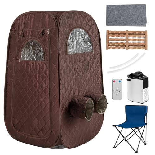 Costway Bärbar ångbastu, hemmabastu för 1–2 personer med 3-liters ånggenerator, timer, fjärrkontroll, fotmassageapparat och klappstol, bastutält, sittbastu för hemmabruk, 89 x 89 x 149 cm (brun)