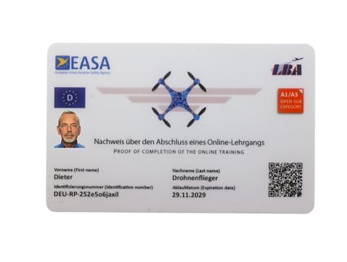 MJ drönare körkort – med QR-kod fotoID och adress på baksidan, kompetensbevis för A1-A3, A2 eller STS-licens i checkkortstorlek, högkvalitativt plastkort med EASA-korthållare som tillval
