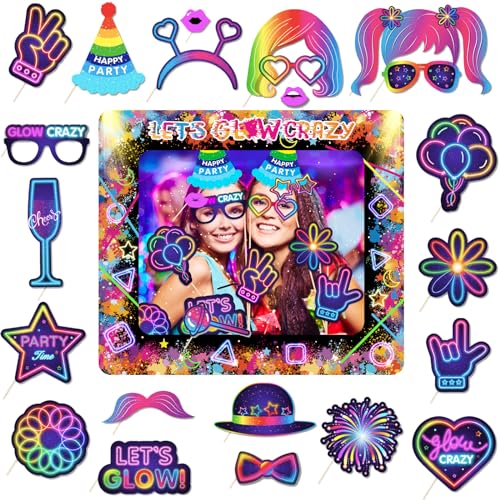 POPOYU 26 stycken Let's Glow Party fotorekvisita, neon uppblåsbar fotoram, disco fotobox tillbehör födelsedag, bildram neon för födelsedag, bal, disco party tillbehör foto ram set