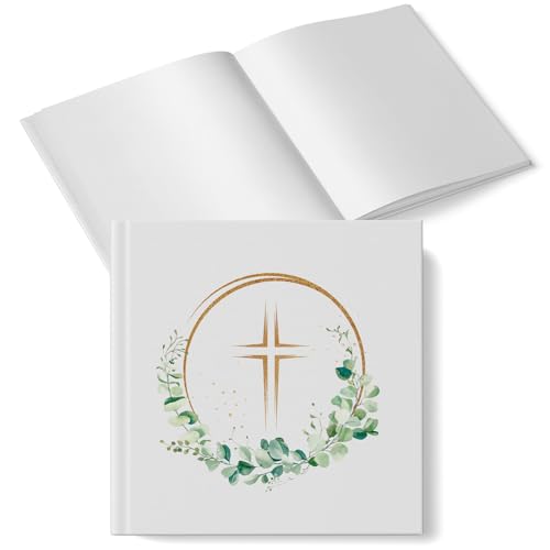 Gästbok med kors och eukalyptuskrans: Fotoalbum för dop, nattvard, konfirmation och firmation, inbunden minnesbok, minnesalbum bröllop, 48 tomma sidor, vit, grön, guld, 15 x 15 cm