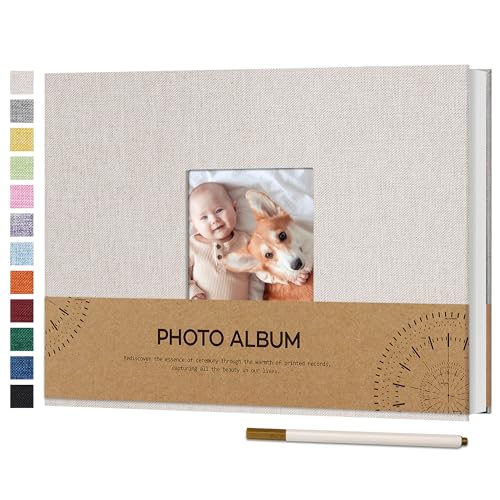 Vienrose Självhäftande fotoalbum med visningsfönster för 4 x 6 foton, linneskydd gör-det-själv scrapbook-album 40 vita sidor för resor, fotobok med kulspetspenna, 21,5 x 30 cm, beige