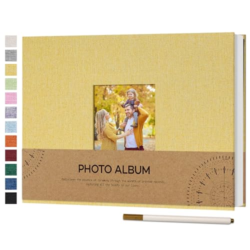 Vienrose Självhäftande fotoalbum med bildfönster för 4 x 6 foton, linneskydd gör-det-själv scrapbook-album 60 vita sidor för resor, fotobok med kulspetspenna, 21,5 x 30 cm, gul
