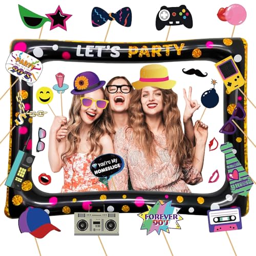 90-tal uppblåsbara bildram med 30 st fotorekvisita, 90-talet fotobooth, 90-tals fest fotobox tillbehör, selfie ram för 90-talet