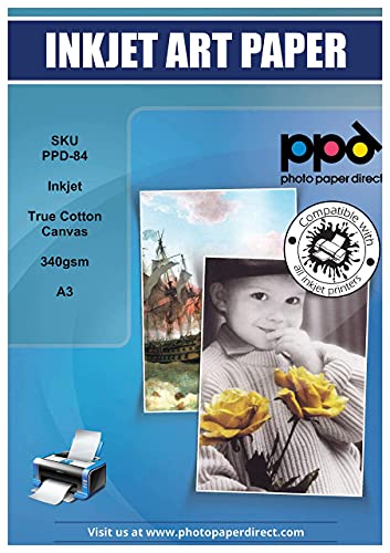 PPD A3 x 10 ark Inkjet 340 g/m2 konstduk canvas fotopapper vit matt, baserat på 100 % bomull, lämplig för alla bläckstråleskrivare PPD-59-10