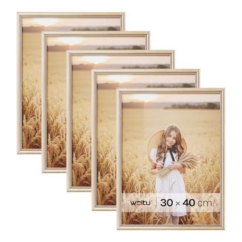 WOLTU Set med 5 fotoram, 30 x 40 cm, ram i massivt trä med passepartout, kan hängas horisontellt eller vertikalt, väggdekoration eller på bord, guld