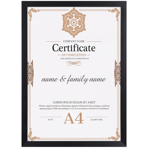 Ditwis A4 fotoram svart, A4 fotoram för certifikat, dokument, konstverk och foton (21 x 29,7 cm), modern ram för vardagsrum, sovrum och kontor