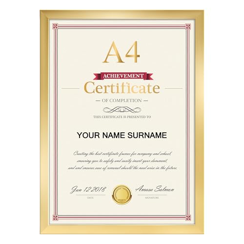 Heimlich® - Fotoram - A4 21 x 30 cm, aluminium metall, guld - examensbevis ram med plastplåtsskydd - väggmontering eller bordsvisning