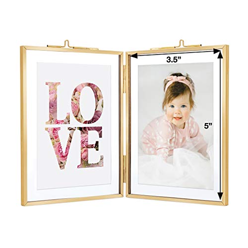 Leoyoubei Flytande glasram, vintage stil och glas fotoram samling metall geometrisk bildram, dubbelglas, metallskrivbord vertikal ram 5 x 7 till 6 x 8 fotovisning (horisontell-guld)