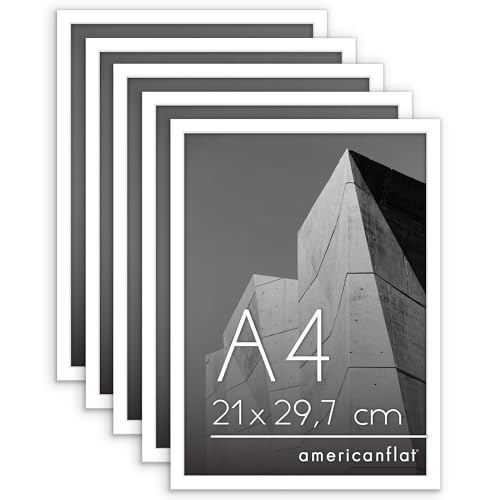 Americanflat A4 fotoramar i Vit – Tunn kant med plexiglas, upphängningsbeslag och integrerat staffli för horisontell eller vertikal visning – Set om 5