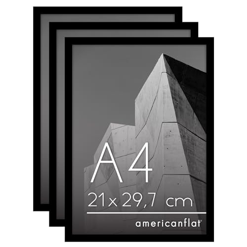 Americanflat A4 fotoramar i Svart – Tunn ram med plexiglas, upphängningsbeslag och integrerat stöd för horisontell eller vertikal visning – Set om 3