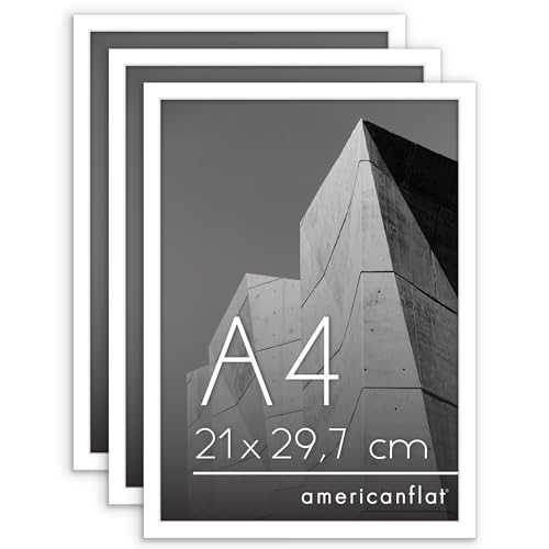Americanflat A4 fotoramar i Vit – Tunn kant med plexiglas, upphängningsbeslag och integrerat staffli för horisontell eller vertikal visning – Set om 3