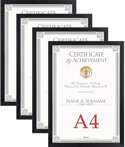 EXYGLO Svart A4 fotoram uppsättning med 4 – klassiska A4-fotoramar för vägg- och bordsblöjor, perfekt för certifikat, affischer, dokument och konstverk