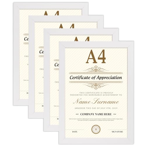 EXYGLO Vit A4 fotoram uppsättning med 4 – klassiska A4-fotoramar för vägg- och bordsblöjor, perfekt för certifikat, affischer, dokument och konstverk