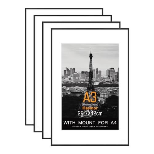 Hesmor Aluminium akryl A3 fotoram i svart, A3 fotoramar 30 x 42 cm storlek A3-ram med klart plexiglas för väggmontering, set med 4 A3-affischram med fäste för A4-tryck