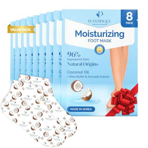 PLANTIFIQUE Koreansk Fuktgivande Fotmask med Sheasmör 8 Par i Box för Torra & Spruckna Fötter | Återfuktande Strumpor för Mjuka Hälar och Reparerande av Torr och Rå Hud | Fotspa | Happy Feet Mask