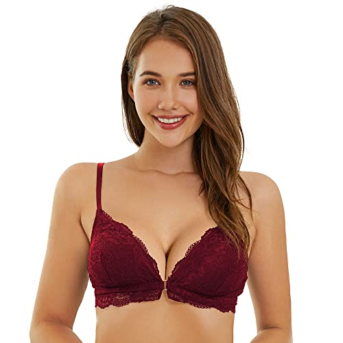 SHEKINI BH dam utan bygel framknäppt behå spets bustier djup urringning avtagbar vadderad bh bekväm bygellös bralette topp sexiga underkläder underkläder underkläder, Vinröd, M