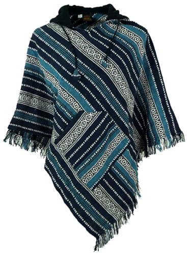 GURU SHOP Poncho Hippie Chic, Andenponcho med fransar, män/kvinnor, svart, bomull, storlek: en storlek, jackor, koftor, ponchos alternativa kläder, blå, En Storlek