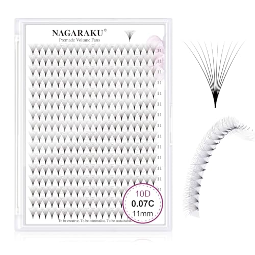 NAGARAKU 10D Förgjorda Volymfransar 320 Fans Volym Premade Fans Lång Stjälk Tunn Bas Spets Naturliga Fluffiga Fächer Fransar Fransförlängning Ögonfrans Ryska Svart 16 Rader Box XL(0.07 D 11mm)