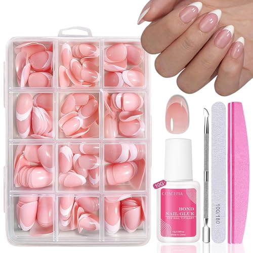 ZAHRVIA Självhäftande naglar, franska falska naglar, korta, mandel, press-on-naglar, tryck på, mjuk gel, återanvändbara, halvtransparenta, för kvinnor (fransk-medium mandel)