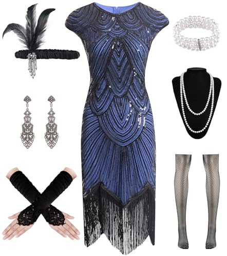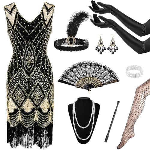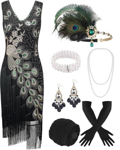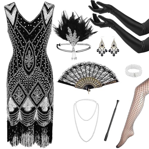 ELFIN 20-tals klänningar fransklänning dam vintage 1920-talet kostym klänningar paljetter fransar Gatsby-klänning 20-tals tillbehör med pannband, huvudbonad, långa svarta handskar, halsband, L, svart