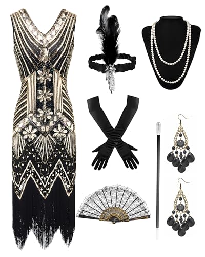 ELECLAND 1920-tals V-ringad paljetter pärlor fransklänning med 20-tals tillbehörsset (svart, stor)