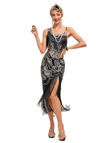 VILOREE 1920-talsklänning för kvinnor, fransklänning, Charleston-klänning, Gatsby, paljetter, cocktail, avslutningsbalklänning, fest, kostym, klänning, Svart (53), XXL