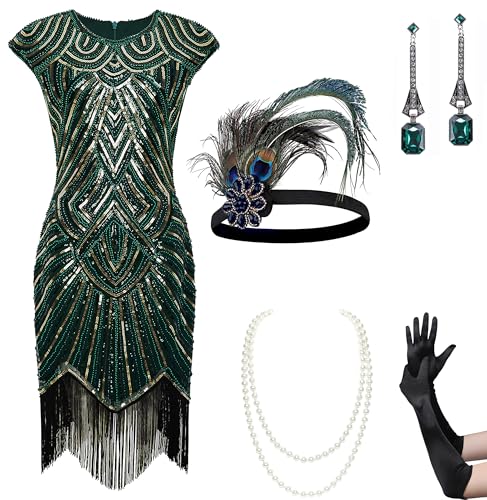 BABEYOND 1920-talsklänning för kvinnor, fransklänning, kort ärm, Gatsby-temafest, damer, kostym, klänning, set, Set – mörkgrön, S