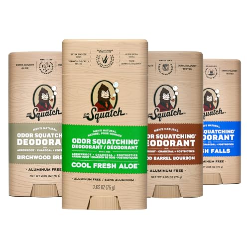 Dr. Squatch Natural Deodorant for Men – Odor-Squatching Men's Deodorant Aluminum Free - Birchwood Breeze, Cool Fresh Aloe, Fresh Falls, Wood Barrel Bourbon (4 Pack)