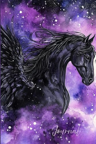 A Celestial Journal of Strength and Serenity: A Magical Notebook Featuring a Winged Black Friesian Horse, Purple Sky, and Watercolor Starry Night