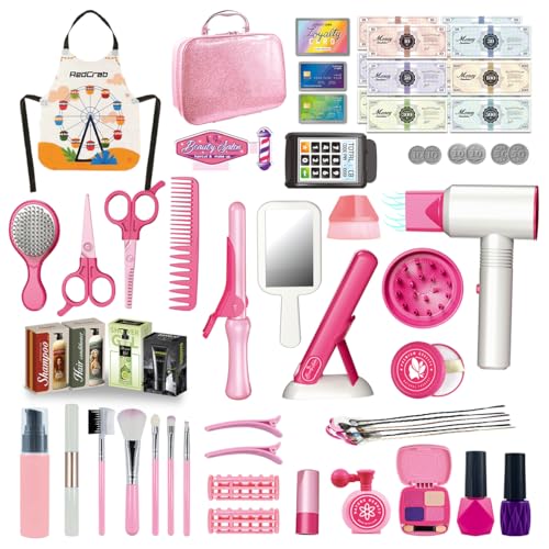 RedCrab Frisör- och sminkväska, skönhetsset för flickor, 55 stycken smink och toalettväska, barn med hårtillbehör, fön med ljud, hårplattare, rollspel för barn från 3 år