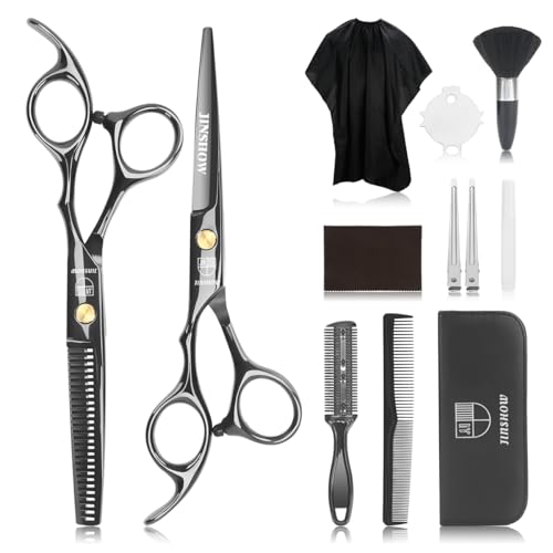 JINSHOW 12 st saxar hår frisör professionella saxar set urtunnande klippklämma kam rostfritt stål skärpåse kit salong barberare kvinnor män barn svart (12)