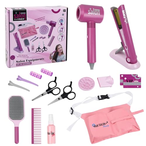 deAO Frisörset barn med hårtork, locktång, kam, spegel, förkläde och frisörsalong tillbehör, frisör leksaker flickor från 3 4 5 6 7 8 år, docktillbehör (rosa)