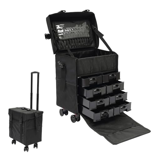 Kosmetisk väska, frisörväska, trolley, sminkväska, med 8 lådor och 360° roterbara hjul, sminkväska, multiväska för resor, kosmetolog frisör, svart, Mode