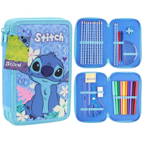 Disney Stitch pennfodral för flickor fyllda med skolmaterial, stor kapacitet Frozen färgning brevpapper set för barn tweens, gåvor för flickor, Blå söm 2 fack, 20x13.5x5cm, Stygn 2 fack