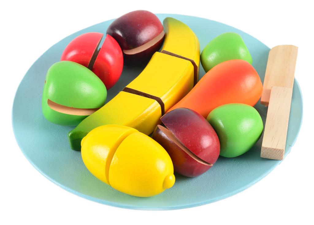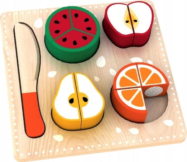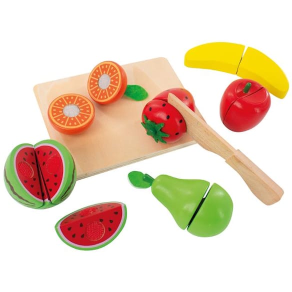 Leksaksmat frukt med skärbräda och kniv - i trä