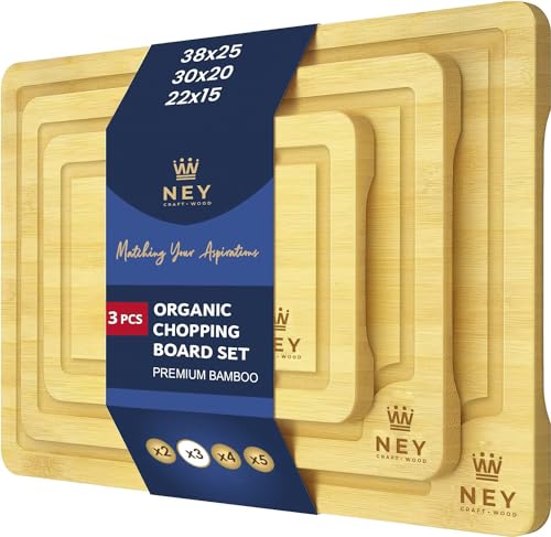 2-i-1 stor premium trä bambu skärbräda set och bricka | uppsättning av 3 | skärbrädsset med juicesåra | professionell kvalitet för kök | perfekta skärbrädor för bröd, kött, frukt