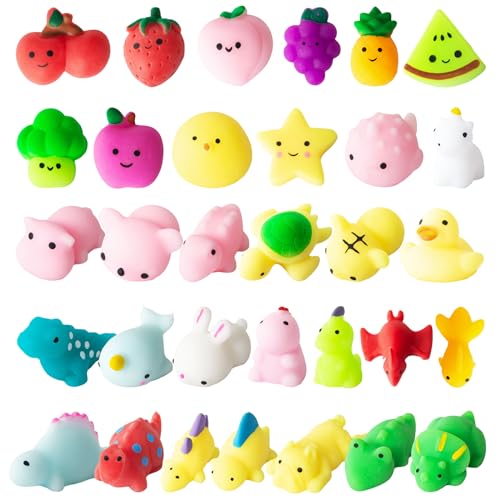 32 stycken Mini Mochi Squishy Set Kawaii Dinosaurier Frukt Djur Squeeze Squishies Anti-Stress-Leksaker Fidget Toy för pojkar och flickor Födelsedagspresent Julklappar Barnkalas