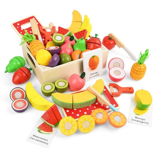 AQXONG 14 st barn kök leksaker av trä set, leksaksset för att skära frukt, fruktleksaker av trä, lämplig för 3 4 5 6 7 8 år gamla pojkar och flickor leksaker