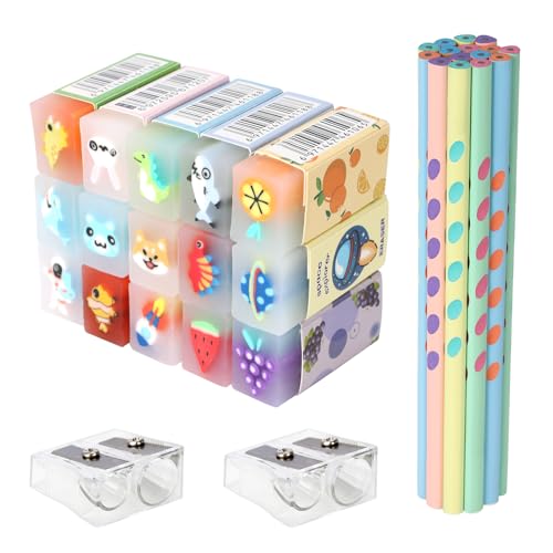 32 stycken suddgummi med skrivstöd pennvässarset, 15 flerfärgade leksaker frukt PVC suddgummi, 15 halkfria triangulära barn blyertspennor HB kostym 2 pennvässare för kontor skola