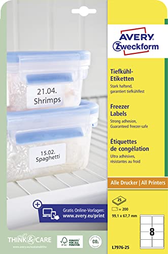 AVERY Zweckform L7976-25 frysetiketter (200 klistermärken, 99,1 x 67,7 mm på A4, självhäftande, temperaturbeständiga och fryssäkra självhäftande etiketter för frys, tryckbar) 25 ark, vit