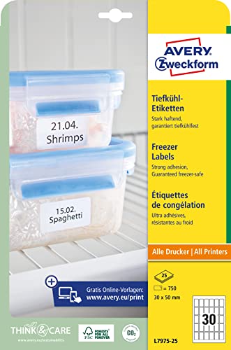 AVERY Zweckform L7975-25 frysetiketter (750 klistermärken, 30 x 50 mm på A4, självhäftande, temperaturbeständiga och fryssäkra självhäftande etiketter för frys, tryckbar) 25 ark, vit