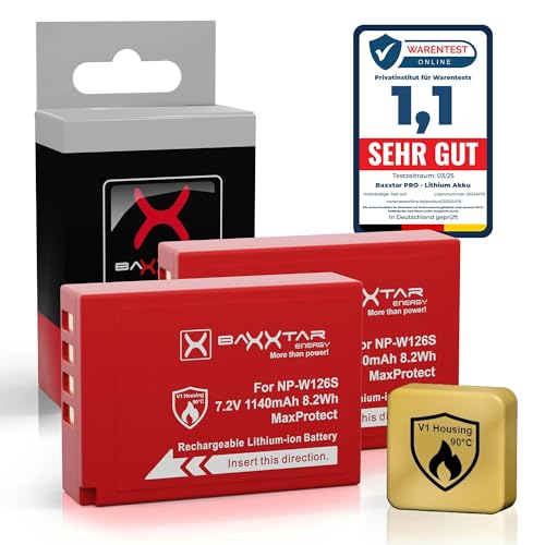 Baxxtar Pro 2X batteri NP-W126s – serie MaxProtect (1140 mAh) med aktiv NTC-sensor och V1-skyddsfodral – utan begränsning av användning - Fuji X100VI X-M5 X-T20 X-T30 X-T30 II X-T50 etc.
