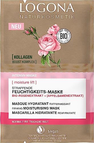 LOGONA Naturkosmetik uppstramande fuktmask, utjämnande ansiktsmask för intensiv fukt med organiskt roseextrakt och kollagen, vegansk närande ansiktsvård, 2 x 4 ml