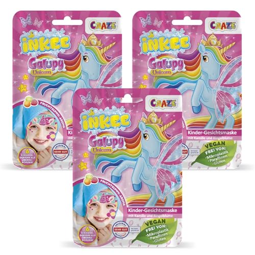 INKEE Ansiktsmask barn GALUPY UNICORN 3-pack | 3 x skönhetstygmasker med fruktgummiarom, kalendula och kamomillextrakt – fuktmask ansikte för flickor