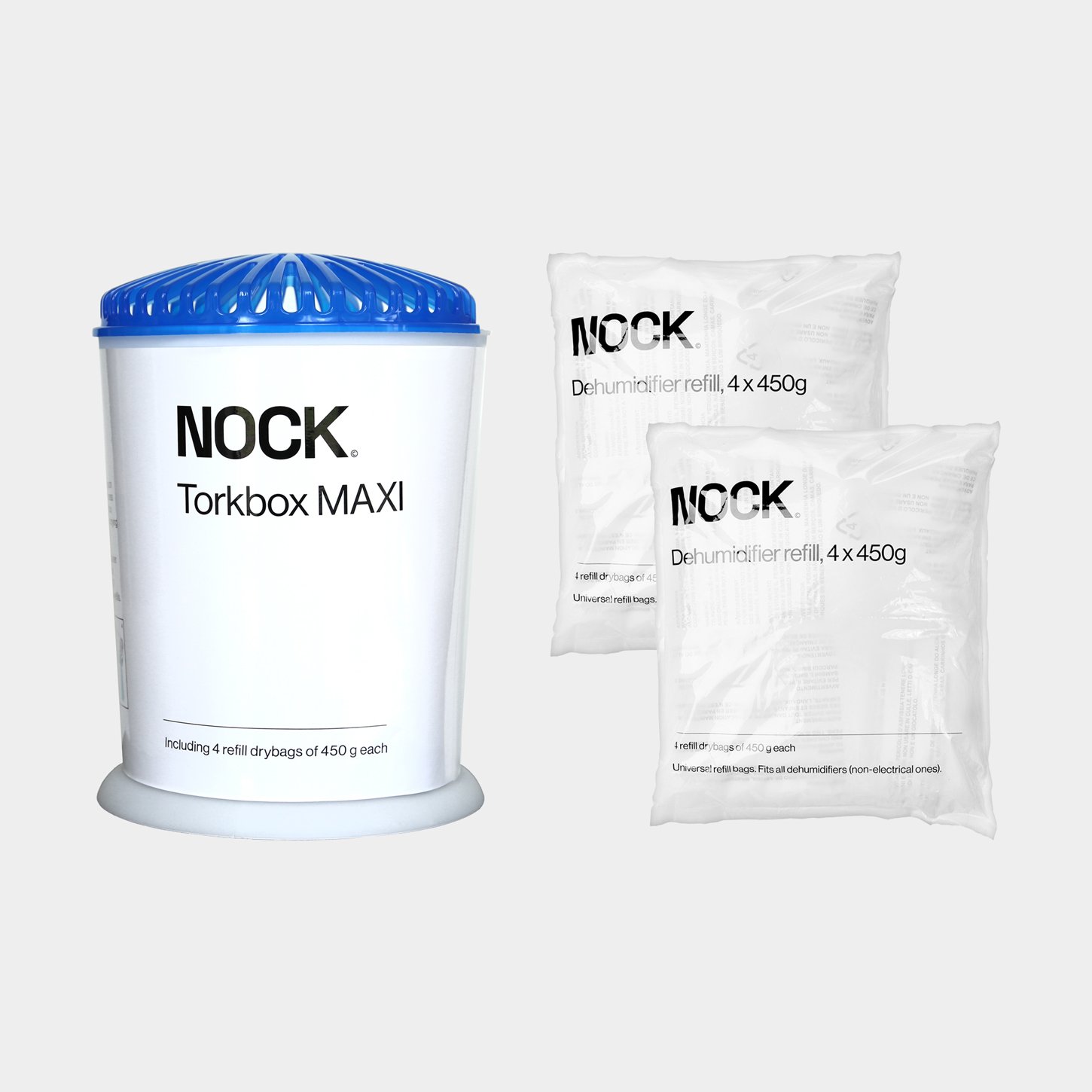 NOCK Fuktslukare Torkbox MAXI, verkningsyta upp till 40 m², påfyllningsbar + 4 torkpatroner (4 x 450 gram)
