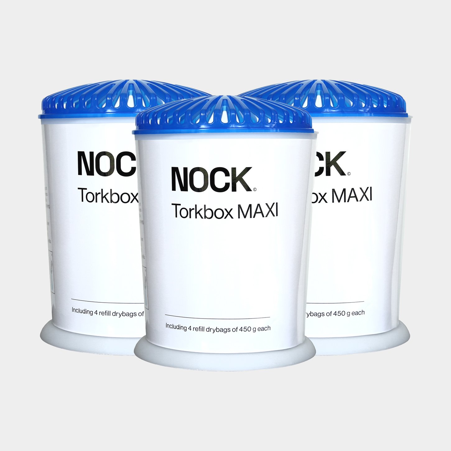 NOCK Fuktslukare Torkbox MAXI, verkningsyta upp till 40 m², påfyllningsbar + 4 torkpatroner (4 x 450 gram), 3-pack