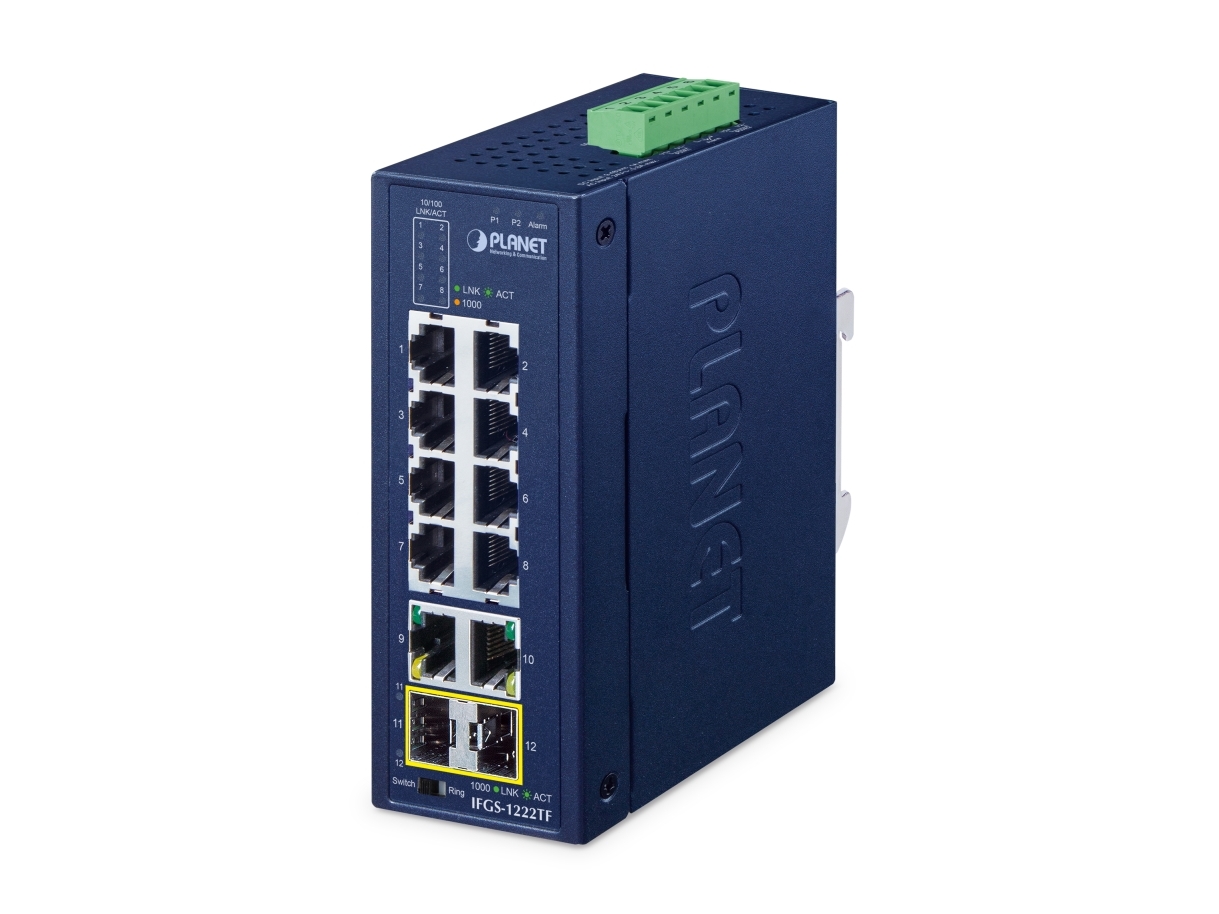 Planet Industrial 8-Port Ring Switch Ifgs-1222-Tf, Ohanterad, Fast Ethernet (10/100), Full Duplex, Monteringsbar På Väggen