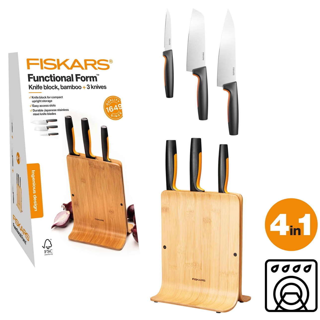 Fiskars Functional Form knivblock i bambu med 3 knivar (1057553) - Fri frakt